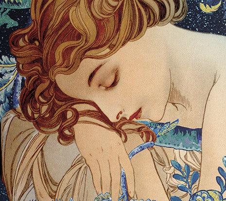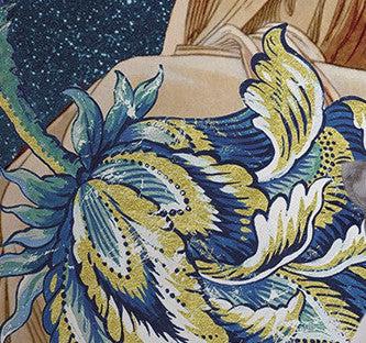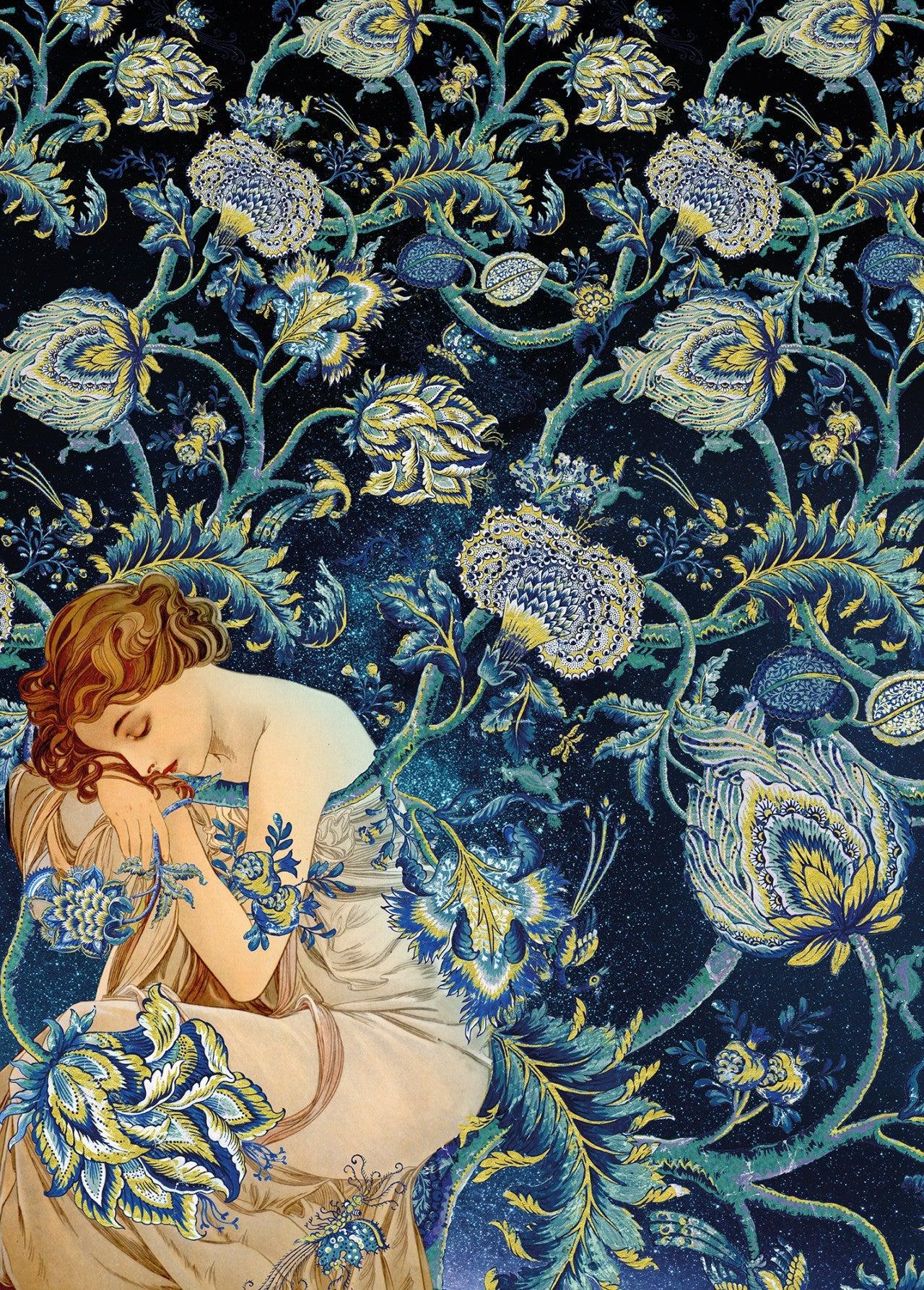 This noble lady enjoys a brief relaxation in her royal garden. A delicate illustration for the most inspiring, natural rooms.